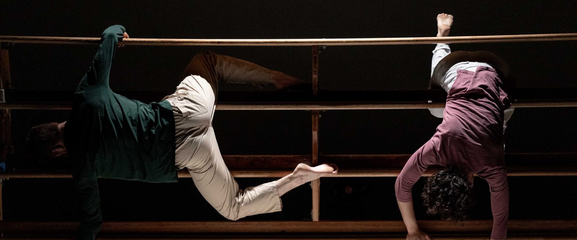 Two dancers wake up in a world of gymnastics benches. They begin to explore new spaces, together and on their own, strangers to each other and yet also close, face to face: BETWEEN SPACES – BETWEEN FACES. The search for a meaning in their everyday madness between loneliness and togetherness drives them on again and again, but their questions are only answered with ever new questions. So they finally leave behind what they once were, strip off their shells and throw them away, forgetting their own expectations and those of the others. They no longer play by rules that are not their own. And in the end, they smash their old world, and use the debris to build a path into something new.