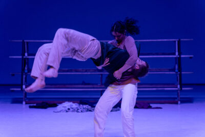 Two dancers wake up in a world of gymnastics benches. They begin to explore new spaces, together and on their own, strangers to each other and yet also close, face to face: BETWEEN SPACES – BETWEEN FACES. The search for a meaning in their everyday madness between loneliness and togetherness drives them on again and again, but their questions are only answered with ever new questions. So they finally leave behind what they once were, strip off their shells and throw them away, forgetting their own expectations and those of the others. They no longer play by rules that are not their own. And in the end, they smash their old world, and use the debris to build a path into something new.