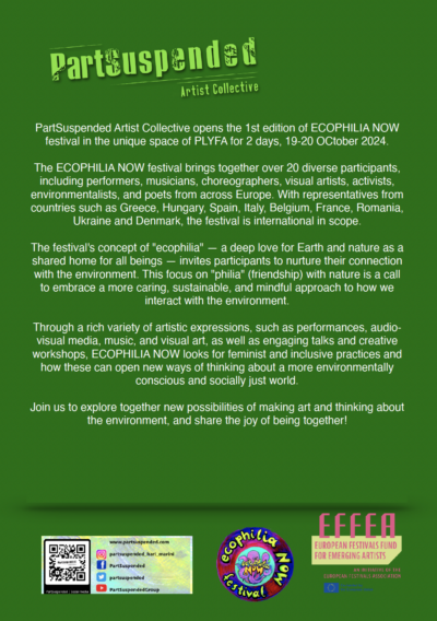 PartSuspended Artist Collective opens the 1st edition of ECOPHILIA NOW festival in the unique space of PLYFA for 2 days, 19-20 October 2024.