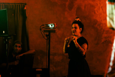 The musicians Irini Alisa and Yiannis Papanikolaou and the interpreters Androniki Xanthopoulou and Olga Dalekou appear on stage.