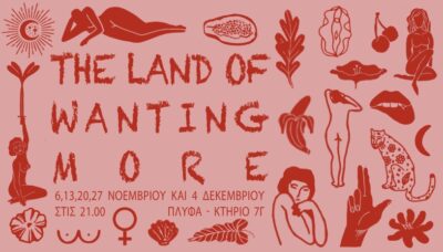 The Land of Wanting More is a mixed-media performance that combines practices from devised theater, the Viewpoints technique, and cinematography. Using dramatic and narrative speech (alternating between roles and actors) and in dialogue with live music, the stories of women come to life as they confront their unconscious, face their desires, and identify with them. The final script of the performance emerged both from research and improvisation, and it is inspired by texts from George Sand, Charles Mee, Judith Butler, Sam Shepard, Camille Paglia, Colette, the poetry of Matsi Hatzilazarou, and real testimonies. These testimonies are personal stories of sexual liberation and loss, as well as sexual, physical, and emotional abuse of women.