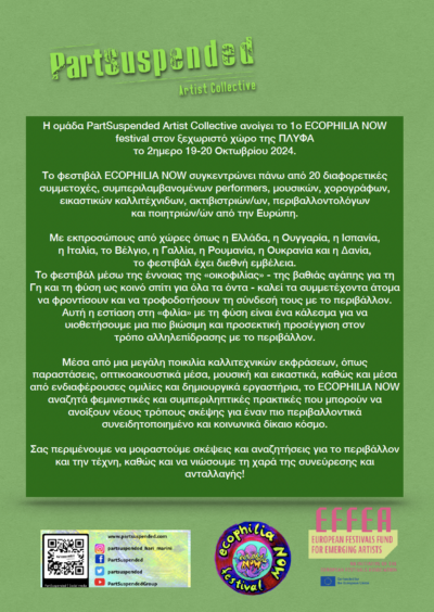 Η ομάδα PartSuspended Artist Collective ανοίγει το 1ο ECOPHILIA NOW festival στον ξεχωριστό χώρο του ΠΛΥΦΑ το 2ήμερο 19-20 Οκτωβρίου 2024.