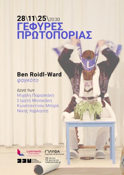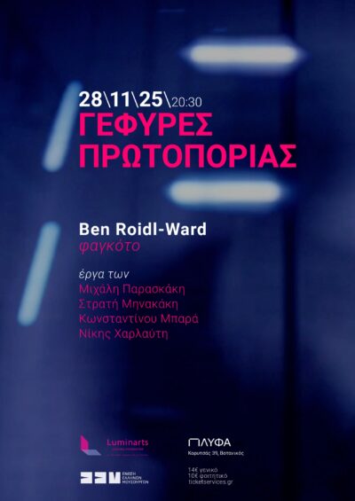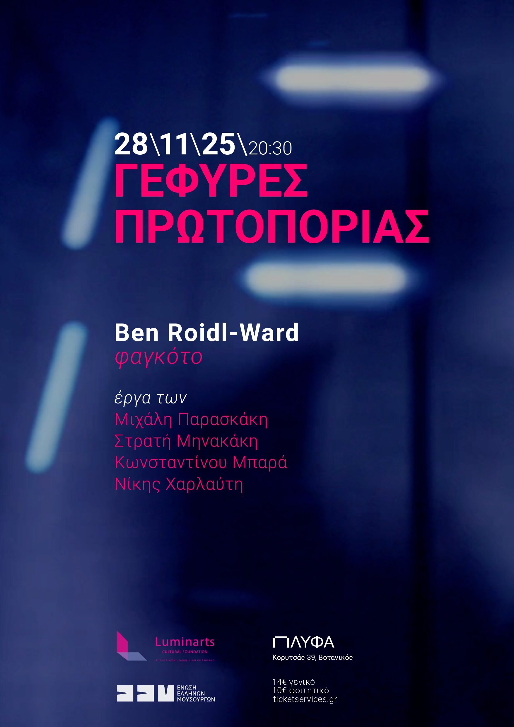 Σας προσκαλούμε στις Γέφυρες Πρωτοπορίας, οι οποίες στον πρώτο τους κύκλο παρουσιάζουν τέσσερα νέα έργα για σόλο φαγκότο από τολμηρούς μουσουργούς με έδρα τις Η.Π.Α. και την Ευρώπη. Η μουσική αυτή παράσταση περιλαμβάνει ηλεκτρονικά, φώτα και μουσικό θέατρο σε ένα πρωτότυπο θέαμα. Η μουσική του Στρατή Μηνακάκη, του Κωνσταντίνου Μπαρά, του Μιχάλη Παρασκάκη και της Νίκης Χαρλαύτη αντλεί έμπνευση από την ελληνική κληρονομιά και τη σύγχρονη ελληνική πραγματικότητα: από την υπερβατικότητα των αρχαίων ελληνικών ύμνων και ναών, τη φιλοσοφία και τη μυθολογία, ως τις προκλήσεις της ζωής στη σύγχρονη Ελλάδα.