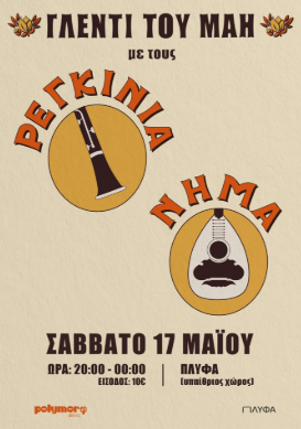 Οι παραδοσιακές μπάντες Ρεγκίνια και Νήμα συναντιούνται στο υπαίθριο Γλέντι του Μάη στον αύλειο χώρο του ΠΛΥΦΑ το Σάββατο 17 Μαίου για να αποχαιρετήσουν την άνοιξη με μουσικές από Θράκη, Ήπειρο, νησιά κ.ά, φέρνοντας έναν καλοκαιρινό αέρα στο κέντρο της Αθήνας.