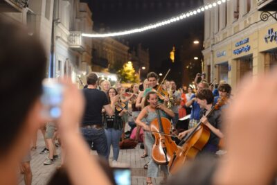 During a tour the orchestra plays five performances a day on average, the musicians can be ready to play in just a few minutes upon arrival (the record being 1 minute and 36 seconds). In accordance with the orchestra’s social mission, all performances are free of charge for the audience.